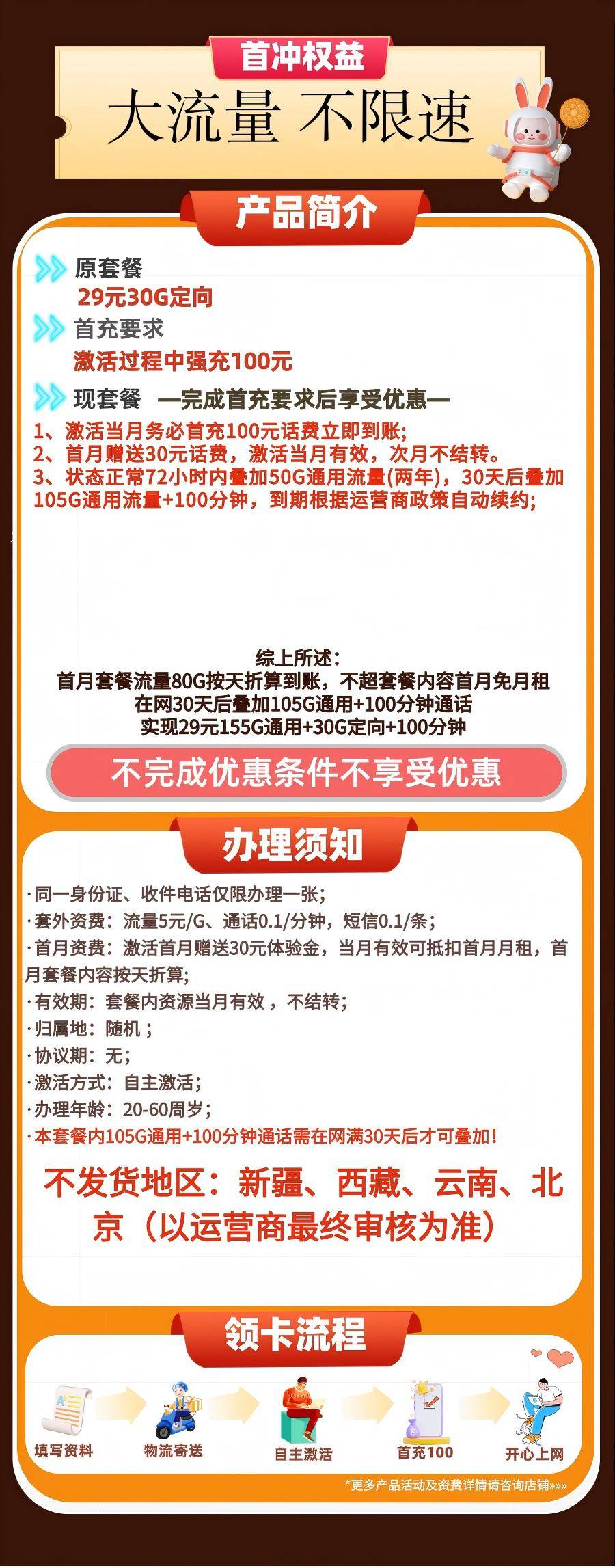 套餐构成: 1、激活当月务必首充100元话费立即到账; 2、首月赠送30元话费,激活当月有效,次月不结转。 3、状态正常72小时内叠加50G通用流量(两年),30天后叠加105G通用流量+100分钟,到期根据运营商政策自动续约; 4、综上所述:首月免费,29元80G全国流量,30天后29元185G全国流量+100分钟,到期根据运营商政策自动续约。 |