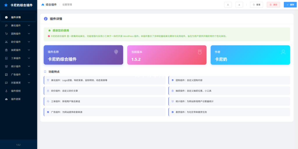 功能范围:美化插件、团购插件、砍价插件、抽奖插件、工单插件、统计插件、广告插件、悬赏插件